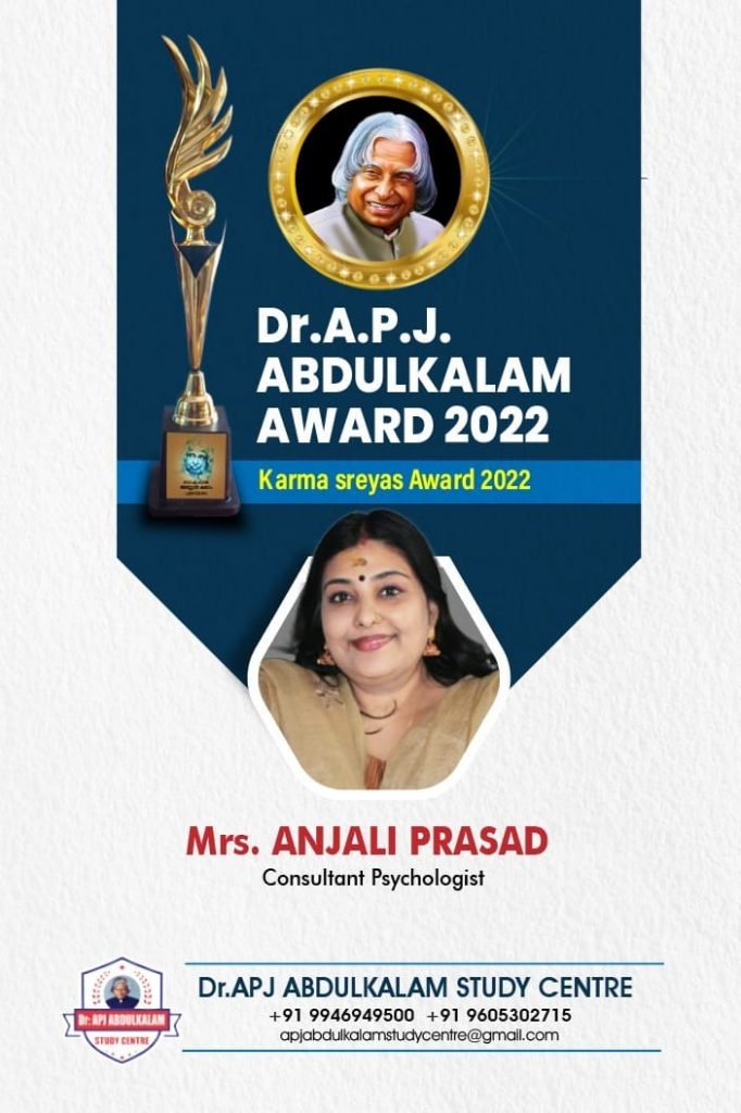 Anjali Prasad, a distiguished psychological Counsellor and Motivational Speaker has been honored as Best Psychological Counsellor and Motivational Speaker.This prestigious recognition was presented by the respected Revenue Minister, Shri.Adv.K.Rajan